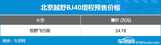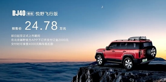 1月27日,北京越野BJ40增程悦野飞行版正式开启预售,预售价为24.78万元。作为BJ40家族中唯一具备“空中拓展”能力的车型,新车将硬派越野与低空科技深度融合,为户外摄影及复杂路况侦测提供了全新的解决方案。