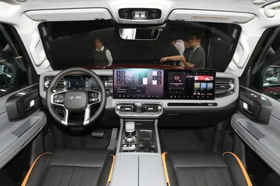 内饰方面,新车在保持硬朗氛围的同时,全面拥抱数字化转型。座舱内配备了10.25英寸全液晶仪表盘,并搭载15.6英寸中控屏+15.6英寸副驾娱乐屏。车机内置了高通骁龙8155芯片,无人机可实现语音控制和一键操控、车头画面车队共享和智能影像回传,拓展越野探索场景。